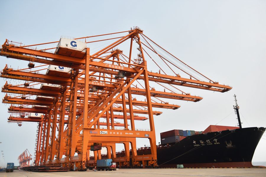 Photo taken on April 11, 2019 shows a cargo ship in Qinzhou Port, south China's Guangxi Zhuang Autonomous Region. (Xinhua/Cao Yiming)