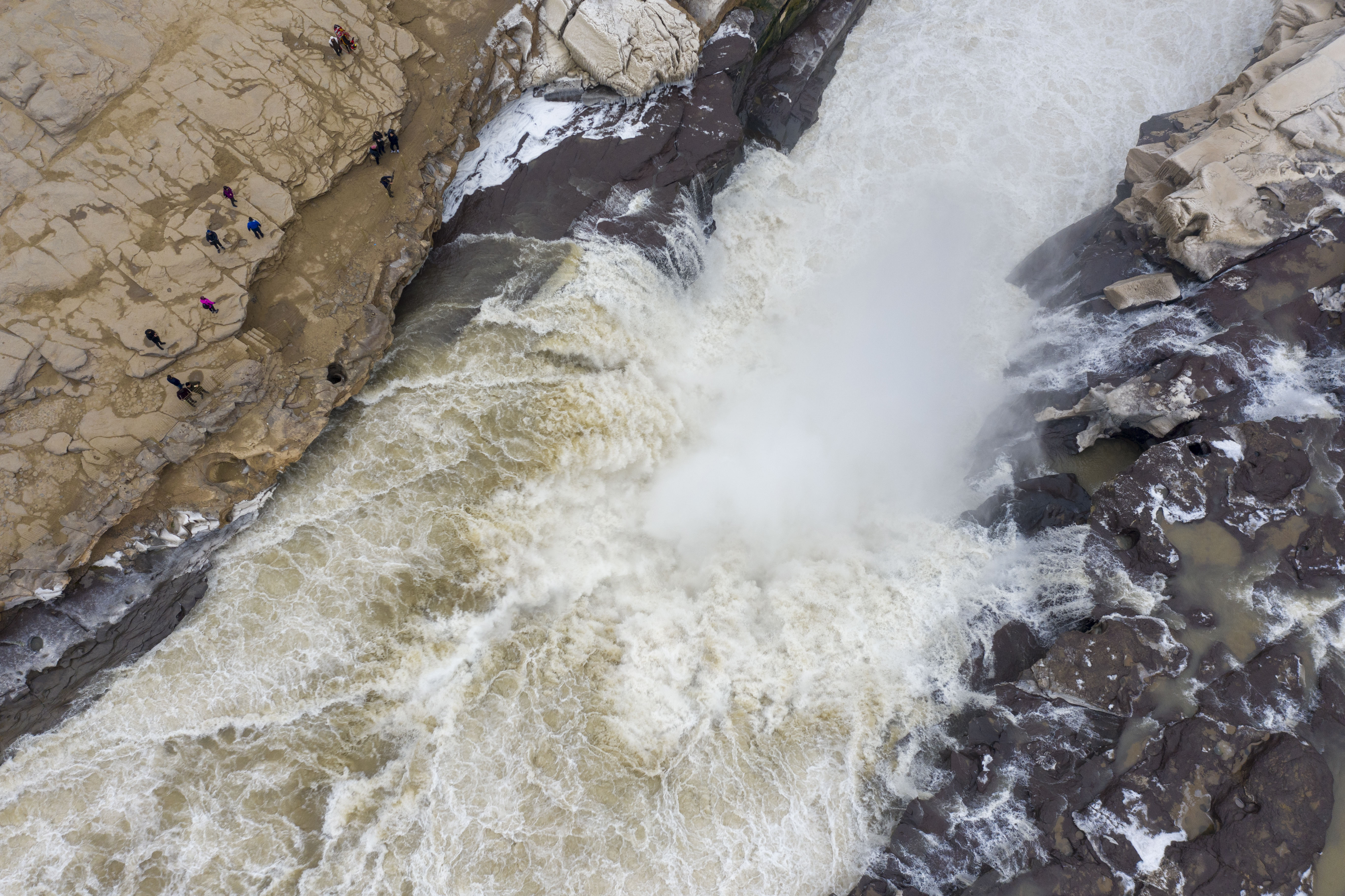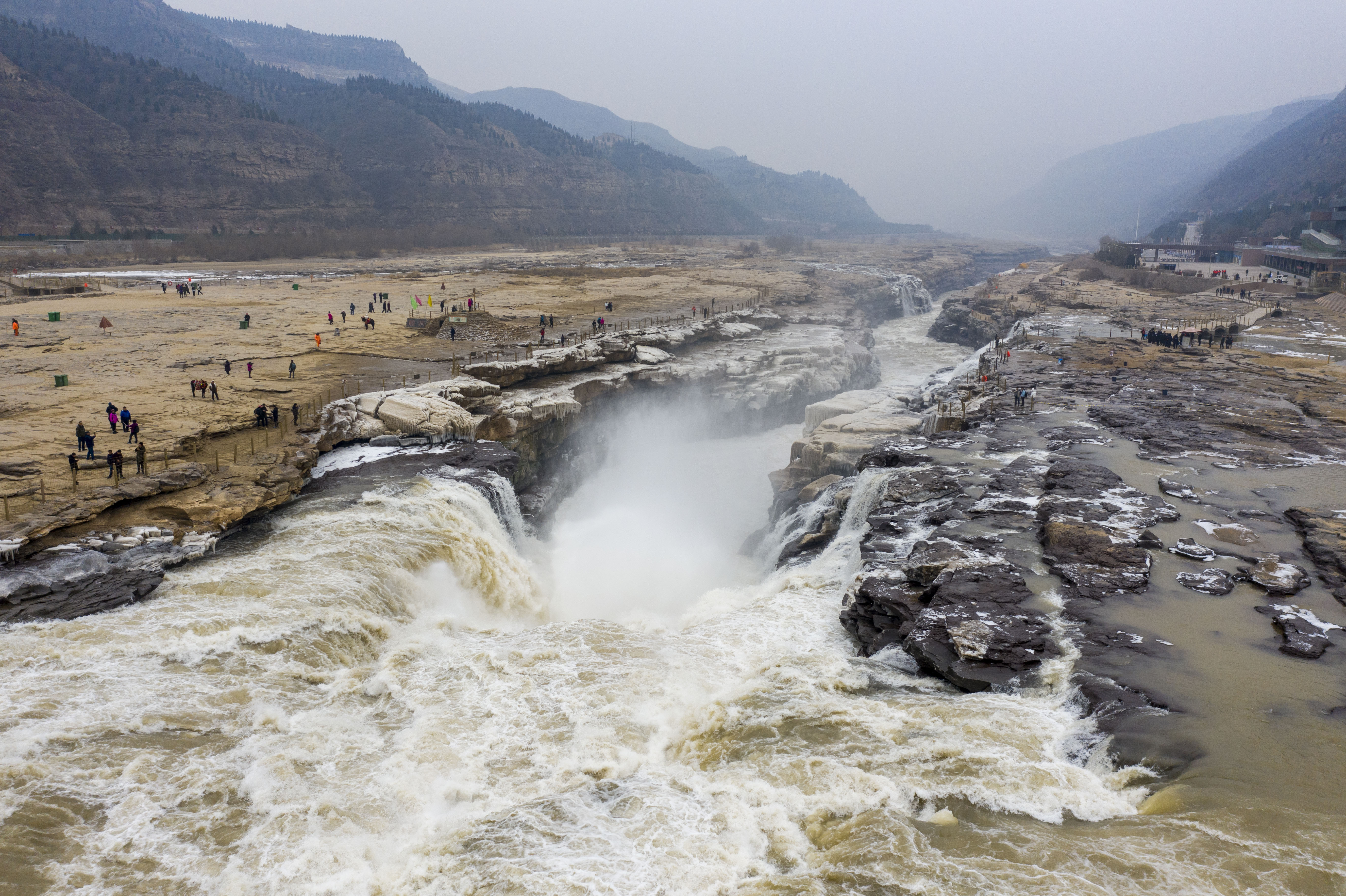 Aerial photo shows tourists visiting the Hukou Waterfall scenic spot in Jixian, north China's Shanxi Province, Dec. 24, 2019.(Xinhua/Yang Chenguang)