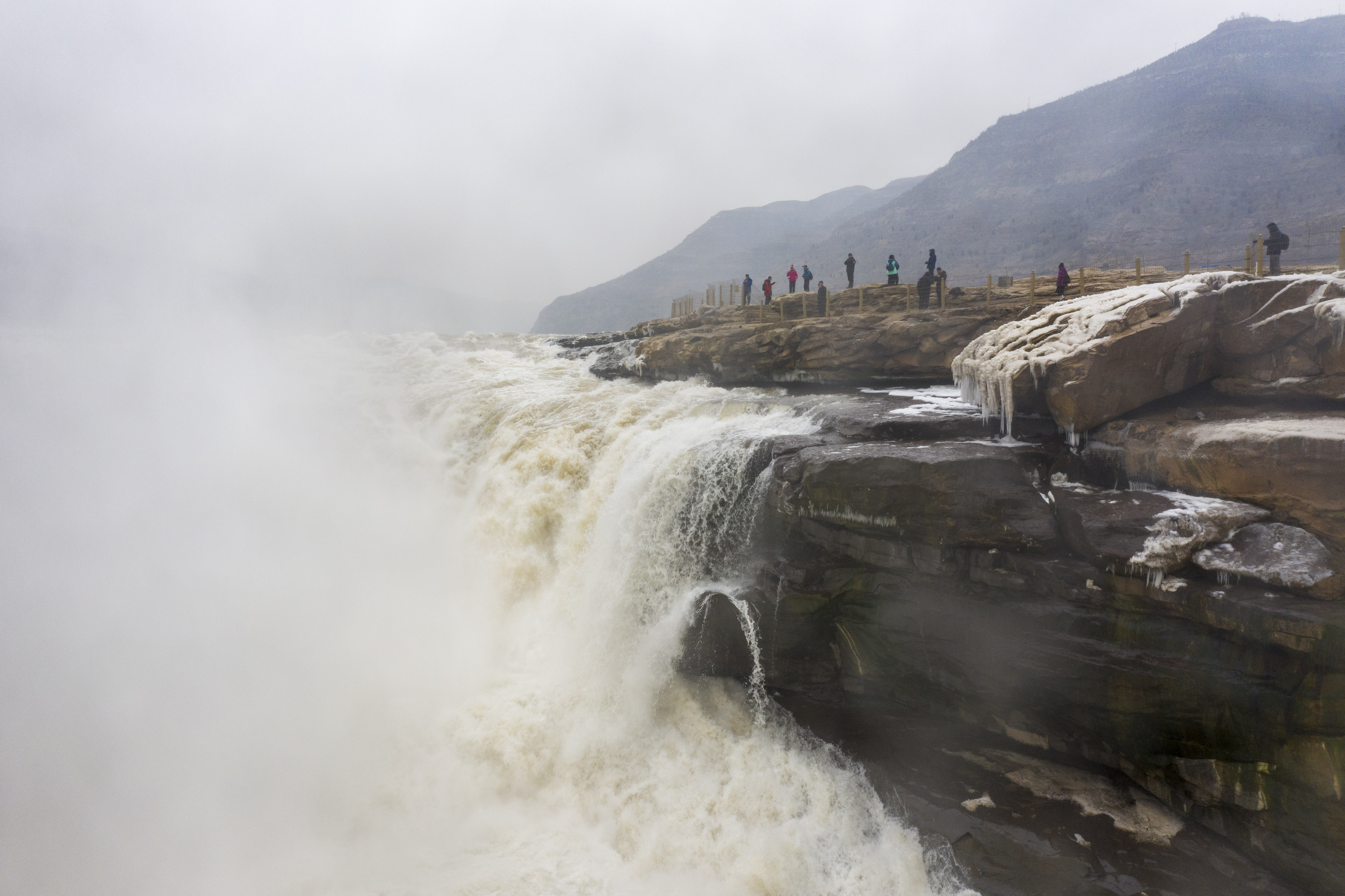 Tourists visit the Hukou Waterfall scenic spot in Jixian, north China's Shanxi Province, Dec. 24, 2019. Hukou waterfall is located on the border area between north China's Shanxi and northwest China's Shaanxi provinces. (Xinhua/Yang Chenguang)