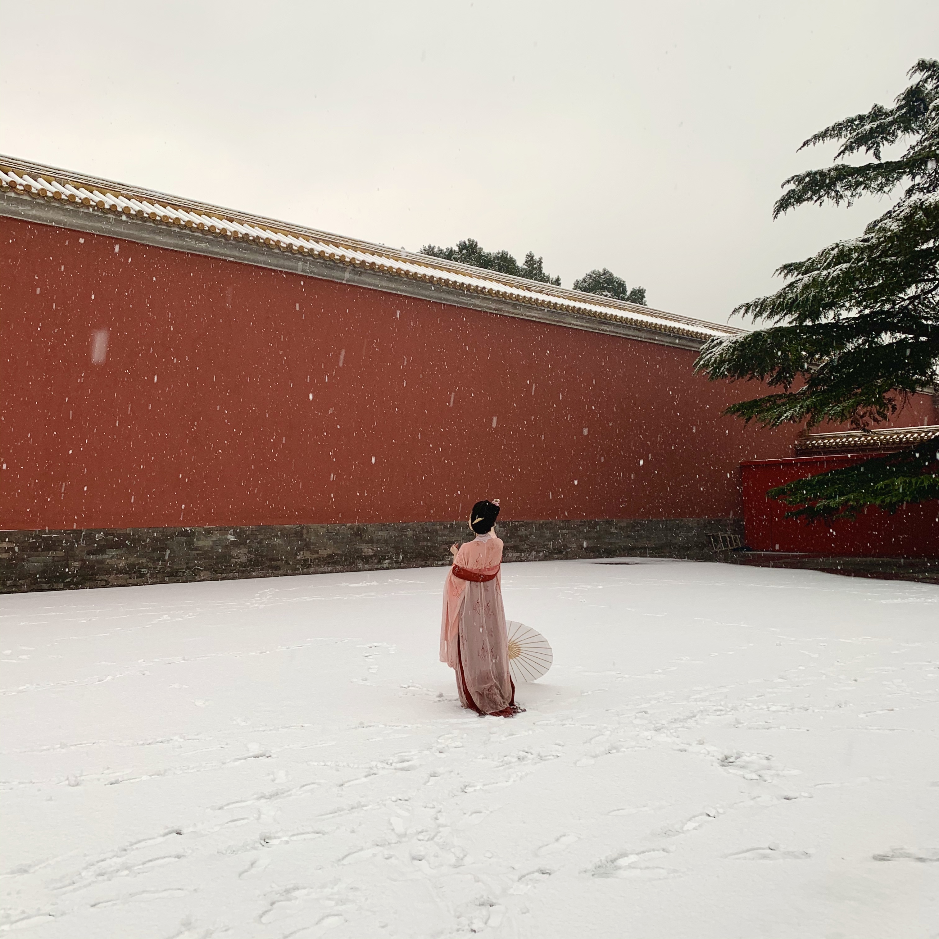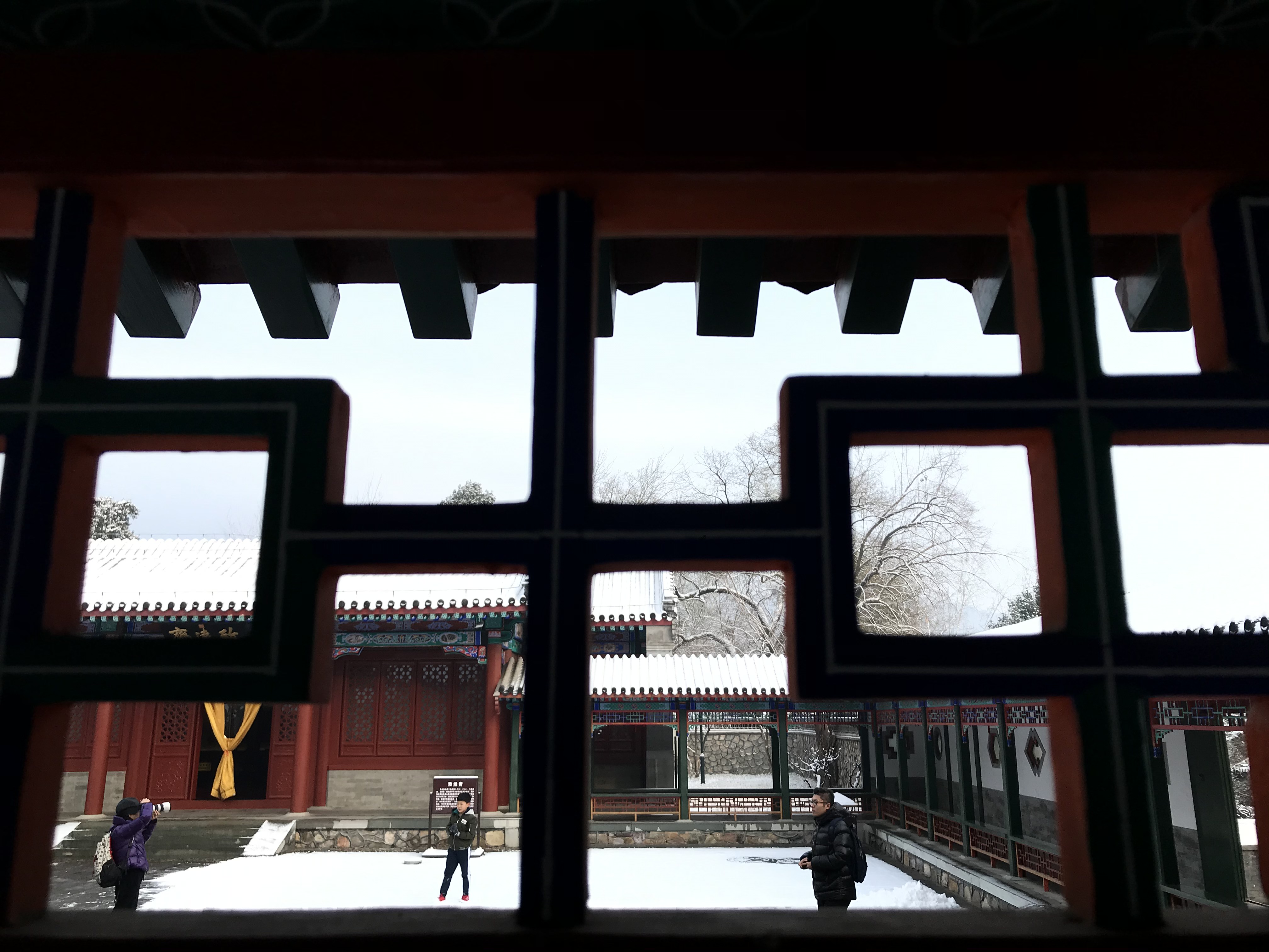 Mobile photo shows a visitor posing for photos at the Imperial Ancestral Temple after snow in Beijing, capital of China, Dec.16, 2019. (Xinhua/Liu Bin)