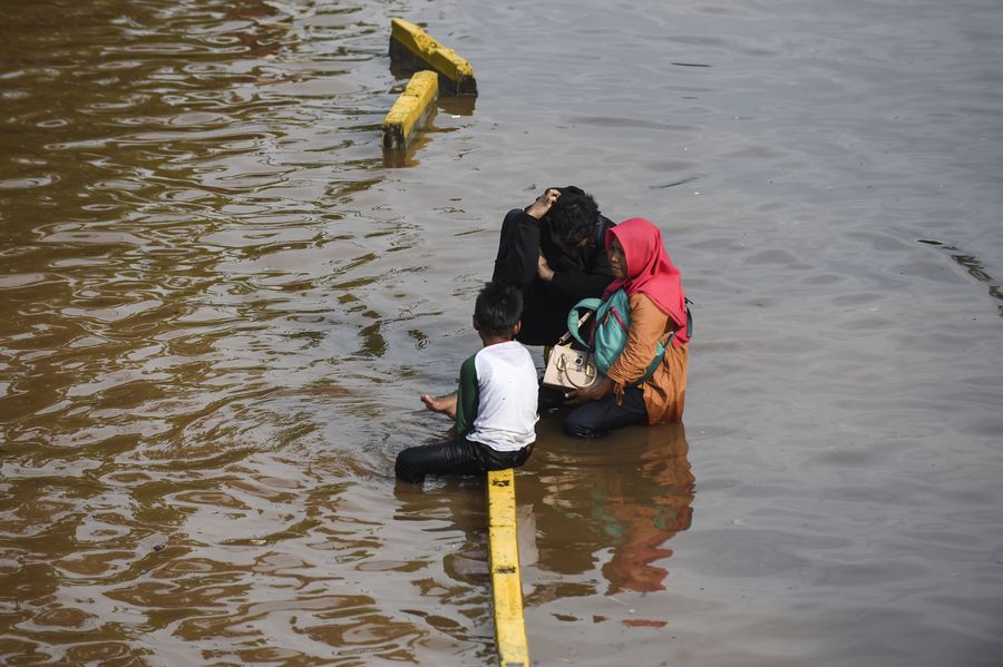 People sit on road barriers in the middle of flood water in Jakarta, Indonesia, Jan. 2, 2020. (Xinhua/Agung Kuncahya B.)