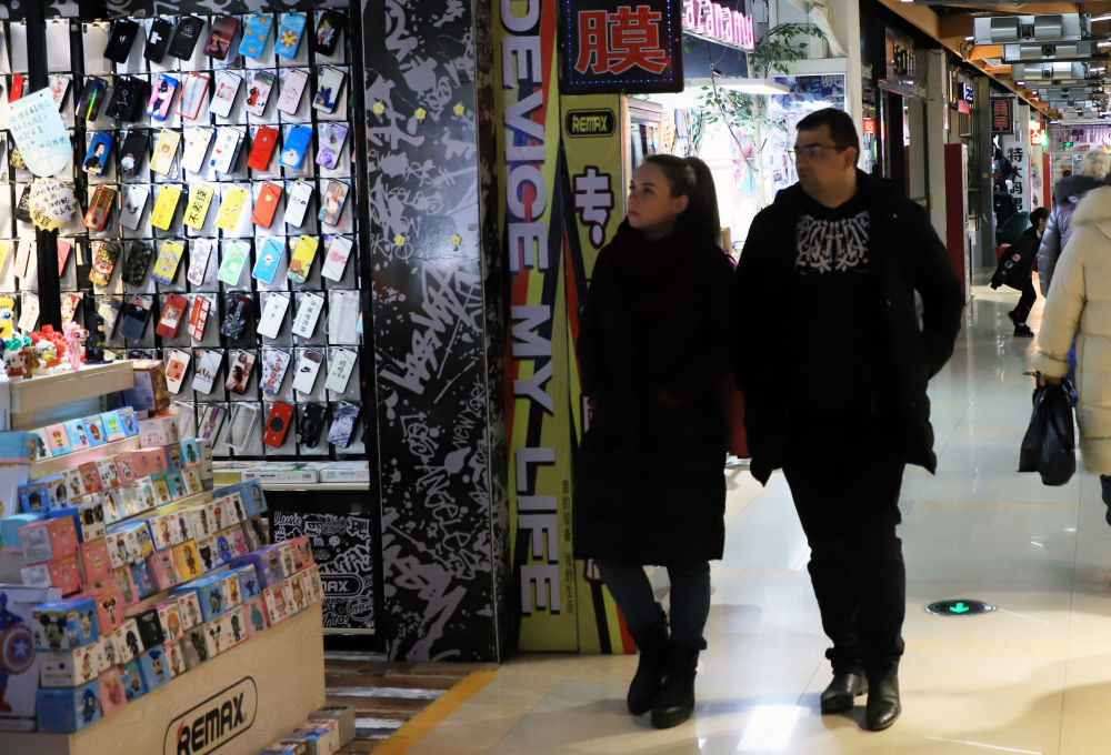 Russian tourists shop in a market in Hunchun, northeast China's Jilin Province, Dec. 31, 2019. (Xinhua/Luo Yuan)