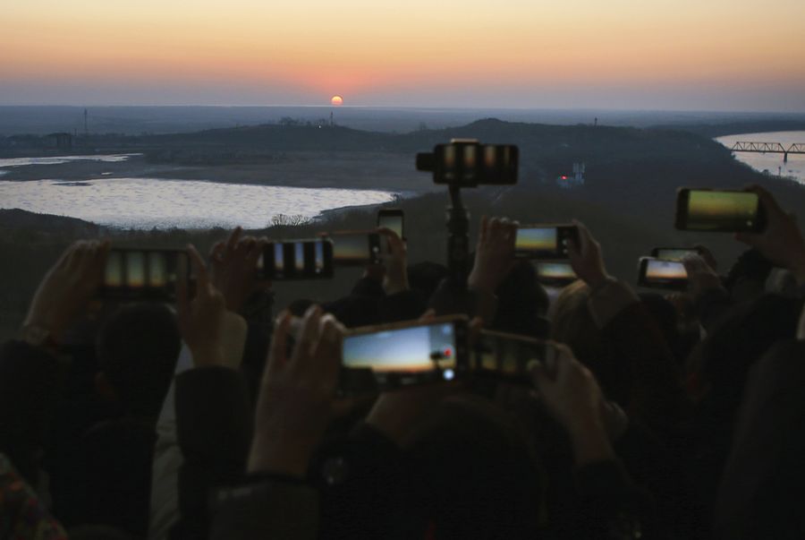 People watch the sunrise scenery in Hunchun, northeast China's Jilin Province, Jan. 1, 2020. (Xinhua/Luo Yuan)