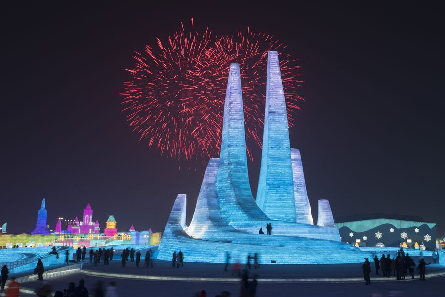 Fireworks explode to celebrate the opening of the 36th Harbin Ice and Snow Festival at Harbin Ice-Snow World in Harbin, capital of China's northernmost Heilongjiang Province, Jan. 5, 2020. (Xinhua/Zhang Tao)