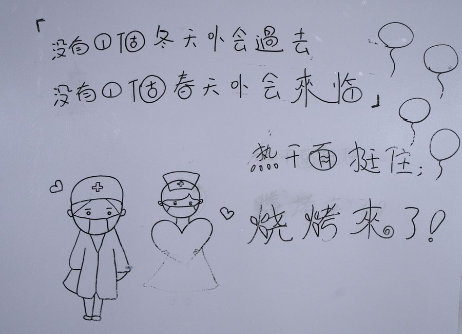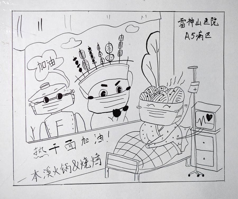 "I started to draw a cartoon on the corridor wall of ward A2 in Leishenshan. That helped me relieve pressure after a day's work," said the nurse. "More and more colleagues and patients come to see those pictures. I never expect them to become so popular."