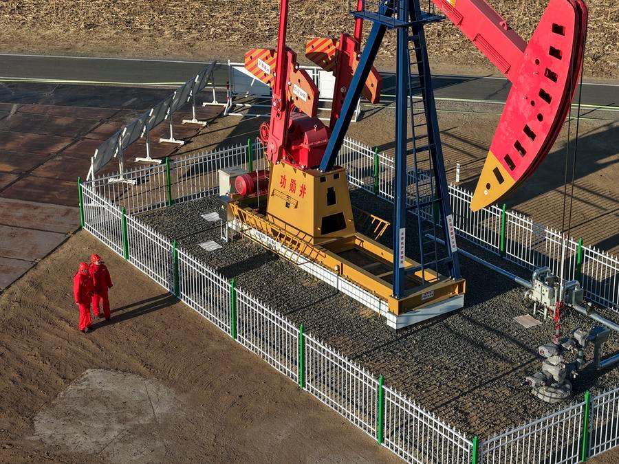 Operators carry out inspection work on oil production equipment at a national-level demonstration zone of continental shale oil of Daqing Oilfield in Daqing, northeast China's Heilongjiang Province, Dec. 4, 2025.  (Xinhua/Wang Song)