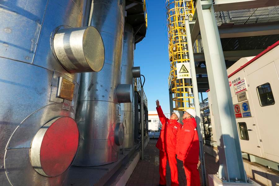 Operators carry out inspection work on oil and gas processing equipment at a national-level demonstration zone of continental shale oil of Daqing Oilfield in Daqing, northeast China's Heilongjiang Province, Dec. 4, 2025. (Xinhua/Wang Song)