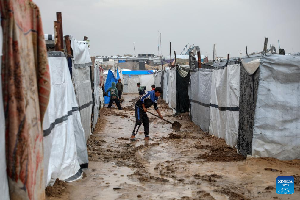 Displaced Palestinians clean the mud outside their tents during a rain in the Zeitoun neighborhood, southeast of Gaza City, on Dec. 11, 2025. (Photo by Rizek Abdeljawad/Xinhua)