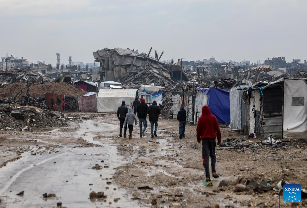 Displaced Palestinians walk outside during a rain in the Zeitoun neighborhood, southeast of Gaza City, on Dec. 11, 2025. (Photo by Rizek Abdeljawad/Xinhua)