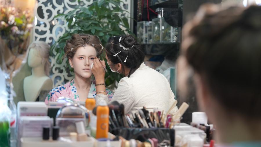 Russian blogger Anastasia wears make-up at a Hanfu rental and photography studio in Luoyang, central China's Henan Province. Dec. 3, 2025. (Xinhua/Yang Jing)
