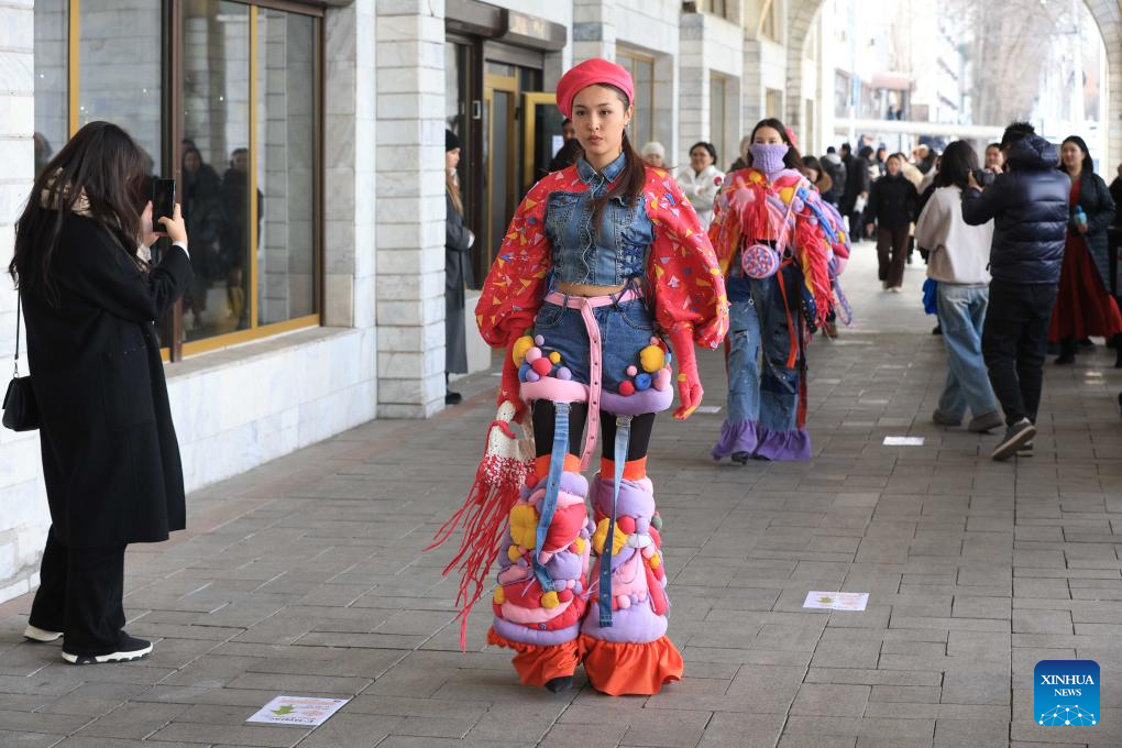 Models display garments made from recycled textile materials at an eco-friendly street fashion show in Bishkek, Kyrgyzstan, Dec. 12, 2025. (Photo by Roman/Xinhua)