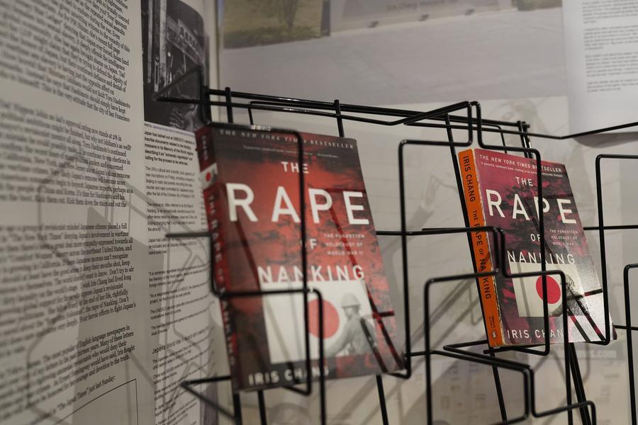 Two books of Iris Chang's "The Rape of Nanking: The Forgotten Holocaust of World War II" are displayed at a reading room of the San Francisco WWII Pacific War Memorial Hall in San Francisco, the United States, Aug. 20, 2022.(Xinhua/Wu Xiaoling)