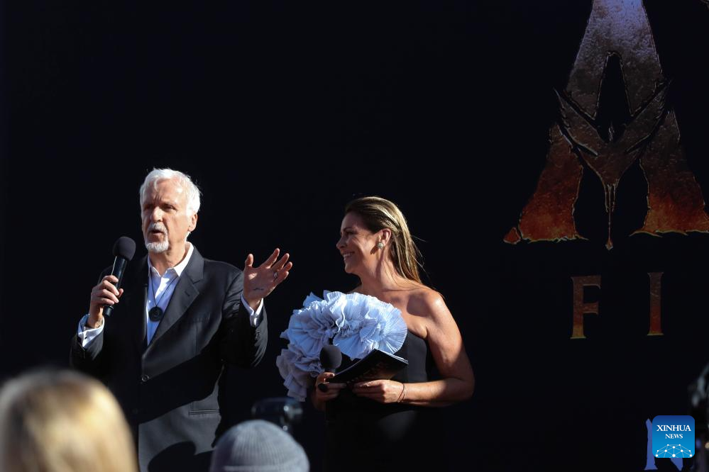 James Cameron (L), director of the film "Avatar: Fire and Ash", speaks at the New Zealand premiere of the film in Wellington, New Zealand, Dec. 13, 2025. The premiere was held here on Saturday, with the participation of director James Cameron and the film's cast. (Photo by Meng Tao/Xinhua)