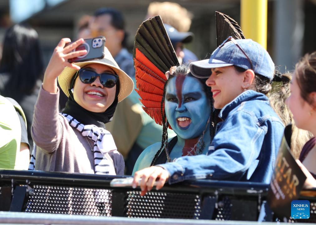 Avatar fans take a selfie at the New Zealand premiere of the film "Avatar: Fire and Ash", in Wellington, New Zealand, Dec. 13, 2025. The premiere was held here on Saturday, with the participation of director James Cameron and the film's cast. (Photo by Meng Tao/Xinhua)