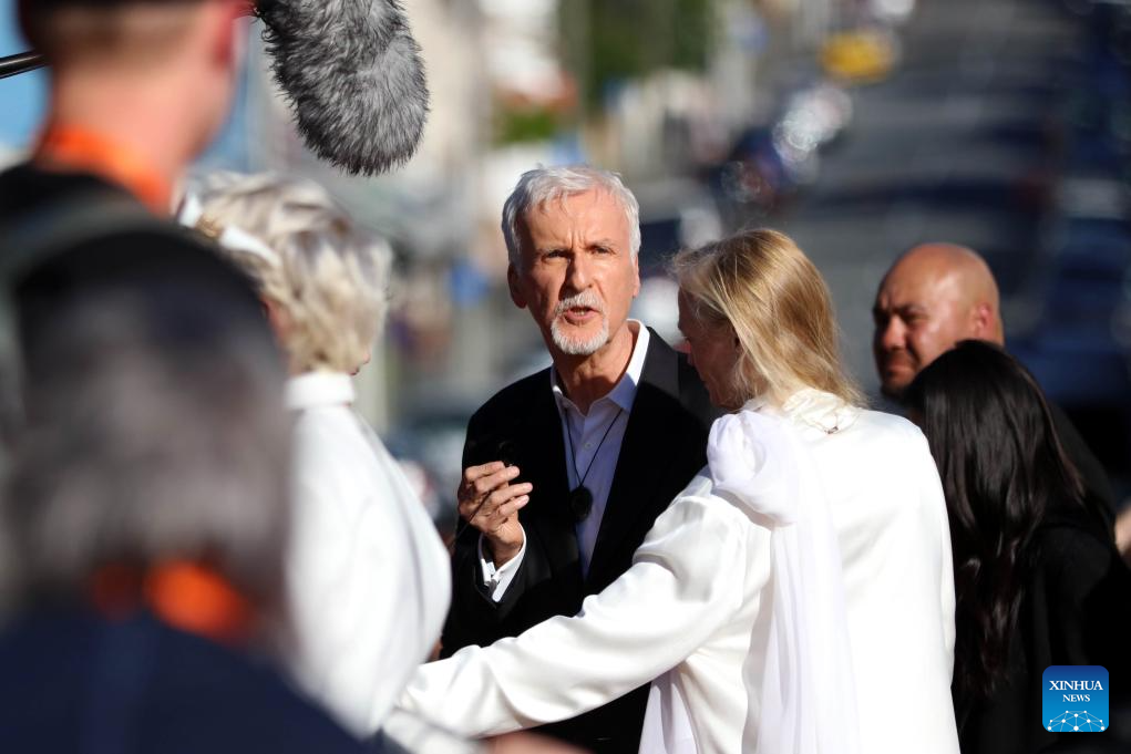 James Cameron (C), director of the film "Avatar: Fire and Ash", attends the New Zealand premiere of the film in Wellington, New Zealand, Dec. 13, 2025. The premiere was held here on Saturday, with the participation of director James Cameron and the film's cast. (Photo by Meng Tao/Xinhua)