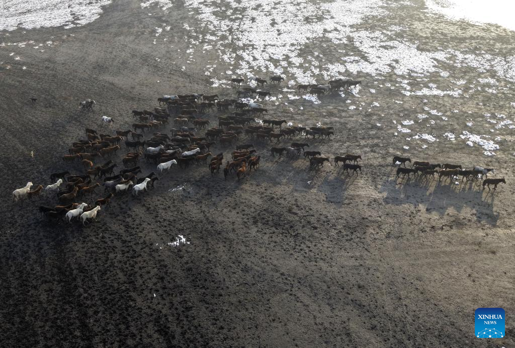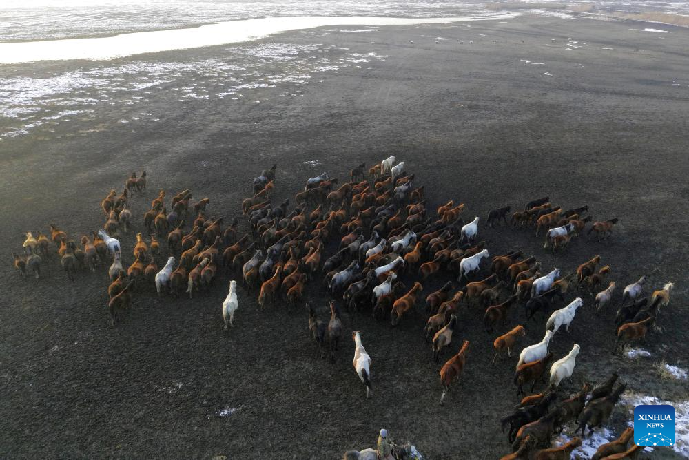 An aerial drone photo taken on Dec. 13, 2025 shows a herd of wild horses at Sultan Reedy National Park in Kayseri, Türkiye. (Mustafa Kaya/Handout via Xinhua)