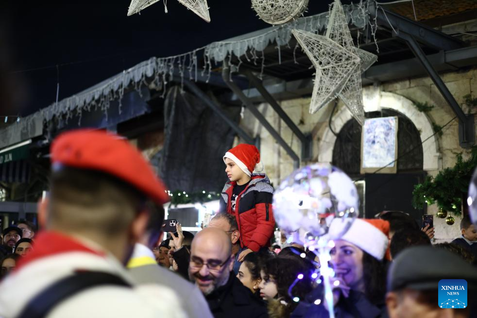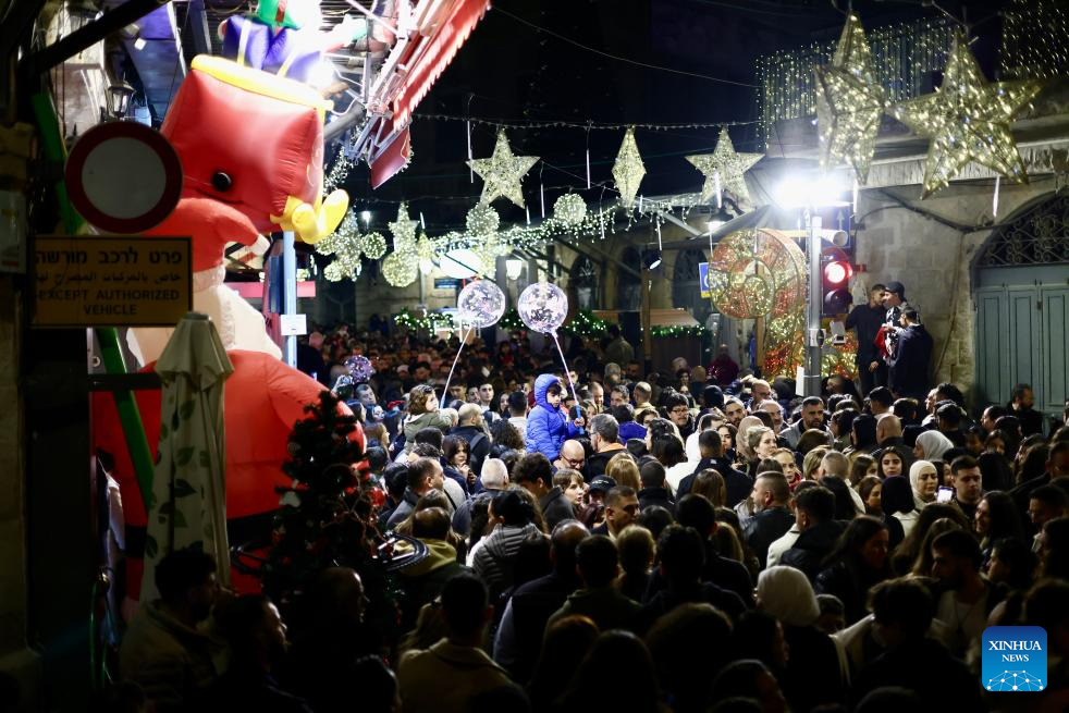 Crowds gather at a street decorated with Christmas lights in Jerusalem's Old City, on Dec. 14, 2025. (Photo by Jamal Awad/Xinhua)