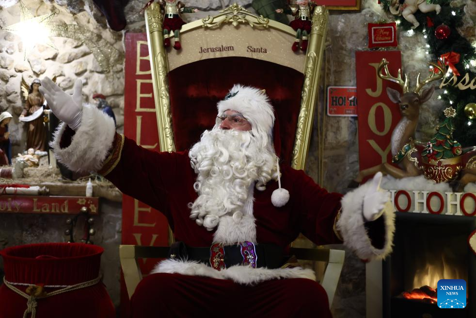 A man dressed as Santa Claus poses for visitors in Jerusalem's Old City, on Dec. 14, 2025. (Photo by Jamal Awad/Xinhua)