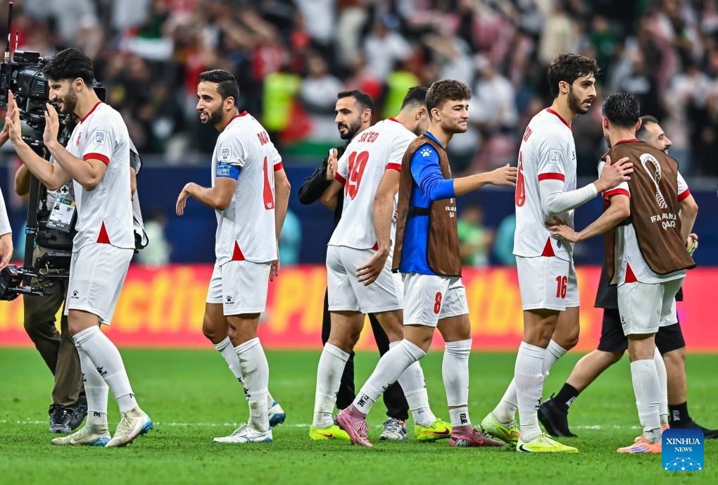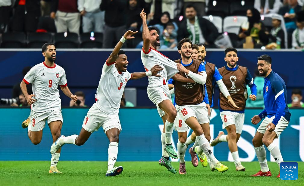 Players of Jordan celebrate after winning the FIFA Arab Cup 2025 Semi-final match between Saudi Arabia and Jordan at Al Bayt Stadium in Al Khor, Qatar, on Dec. 15, 2025. (Photo by Nikku/Xinhua)
