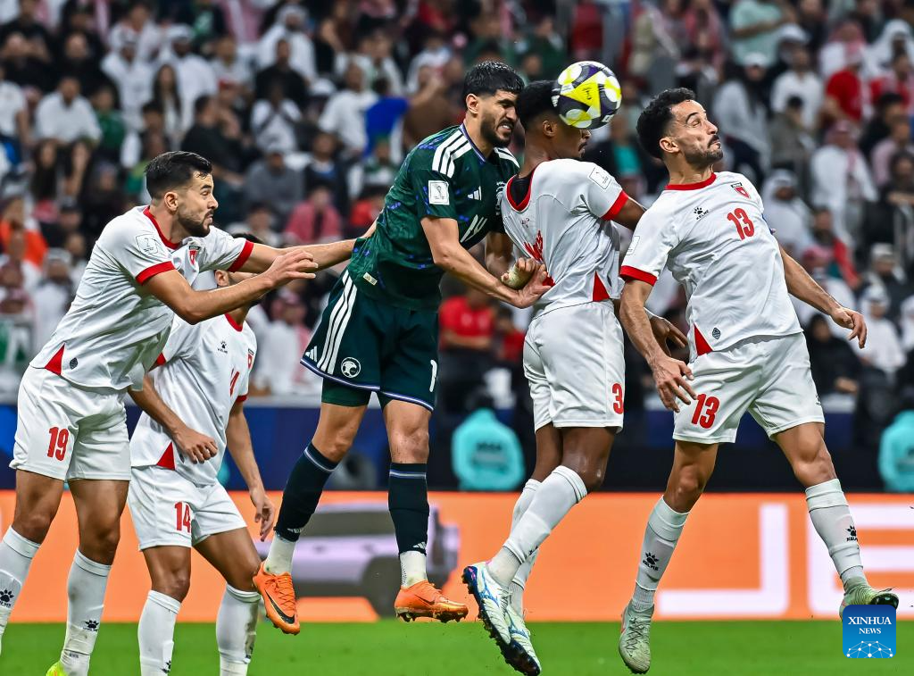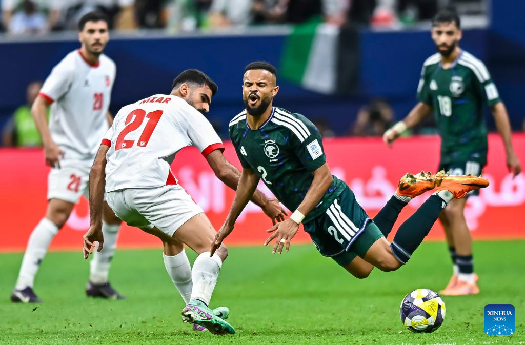 Waleed Alahmad (3rd R) of Saudi Arabia vies with Abdallah Nasib (2nd R) of Jordan during the FIFA Arab Cup 2025 Semi-final match between Saudi Arabia and Jordan at Al Bayt Stadium in Al Khor, Qatar, on Dec. 15, 2025. (Photo by Nikku/Xinhua)