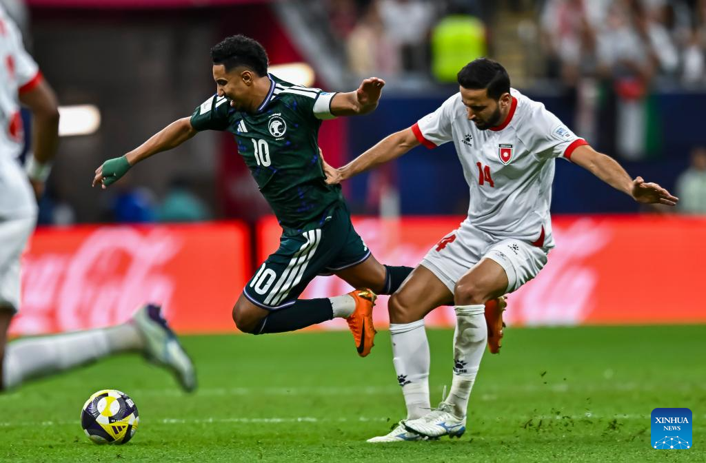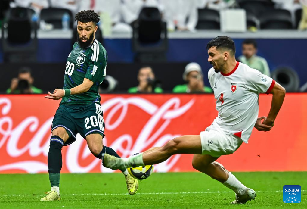 Ali Majrashi (front R) of Saudi Arabiaa vies with Nizar Al Rashdan (front L) of Jordan during the FIFA Arab Cup 2025 Semi-final match between Saudi Arabia and Jordan at Al Bayt Stadium in Al Khor, Qatar, on Dec. 15, 2025. (Photo by Nikku/Xinhua)