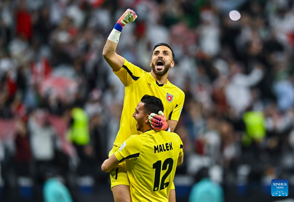 Jordan's team members celebrate with goalkeeper Yazeed Abulaila (top) the FIFA Arab Cup 2025 Semi-final match between Saudi Arabia and Jordan at Al Bayt Stadium in Al Khor, Qatar, on Dec. 15, 2025. (Photo by Nikku/Xinhua)