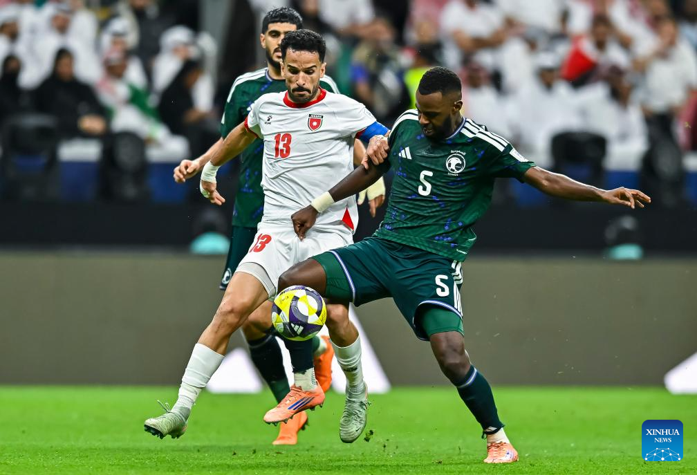 Hassan Altambakti (R) of Saudi Arabia vies with Mahmoud Almardi (C) of Jordan during the FIFA Arab Cup 2025 Semi-final match between Saudi Arabia and Jordan at Al Bayt Stadium in Al Khor, Qatar, on Dec. 15, 2025. (Photo by Nikku/Xinhua)
