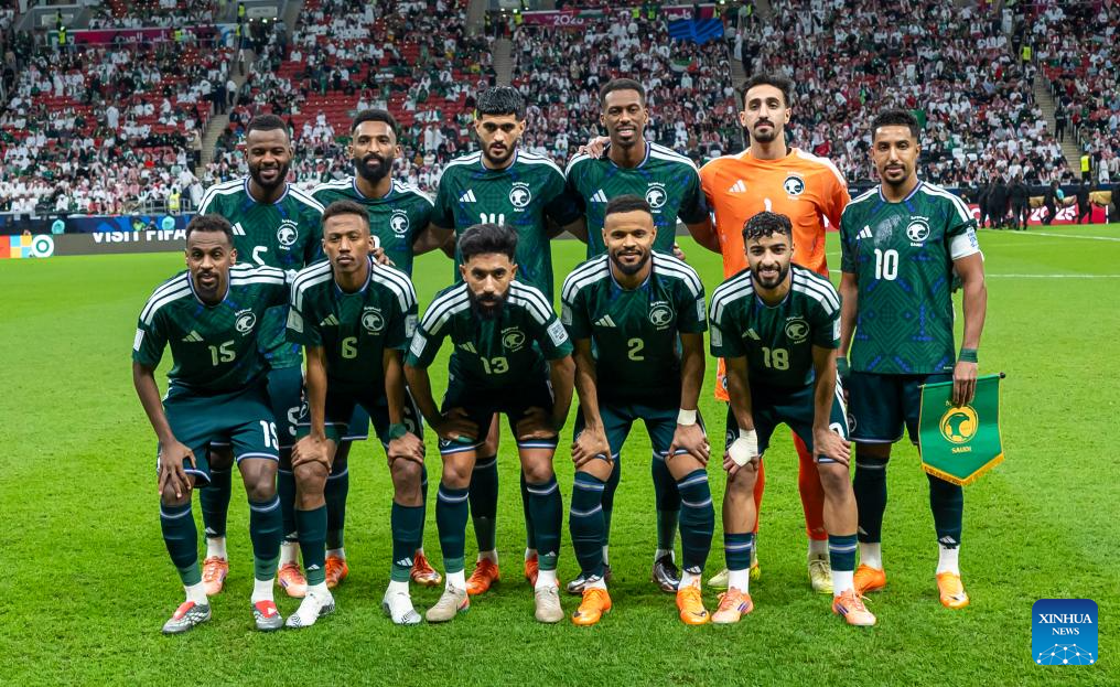 Players of Saudi Arabia pose for a group photo prior to the FIFA Arab Cup 2025 Semi-final match between Saudi Arabia and Jordan at Al Bayt Stadium in Al Khor, Qatar, on Dec. 15, 2025. (Photo by Nikku/Xinhua)