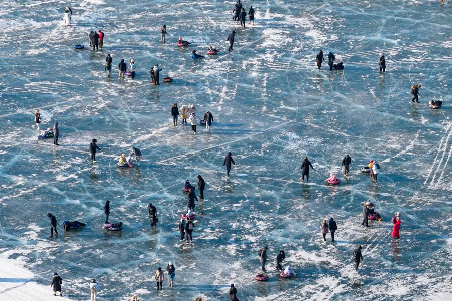 A drone photo shows tourists having fun on ice in Harbin, northeast China's Heilongjiang Province, Jan. 1, 2026. (Xinhua/Zhang Tao)