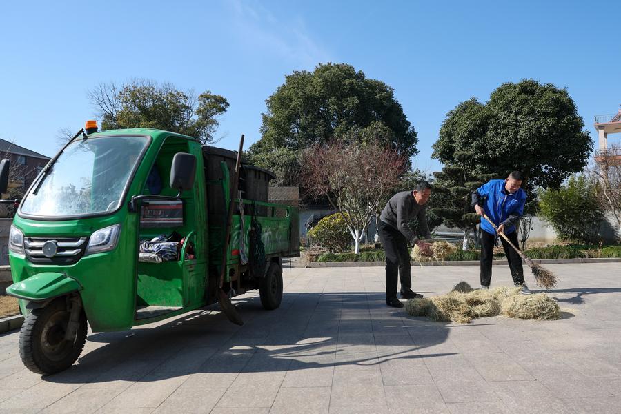 A staff member (R) collects recyclable waste at a villager's home in Puning Village of Hangzhou, east China's Zhejiang Province, Jan. 14, 2026. (Xinhua/Jiang Han)