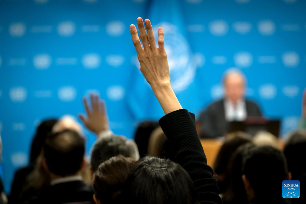 UN Secretary-General Antonio Guterres (in background) holds a start-of-year press conference at the UN headquarters in New York, Jan. 29, 2026. Guterres on Thursday warned that power is prevailing over law globally and called for the acceleration of multipolarity. (Mark Garten/UN Photo/Handout via Xinhua)