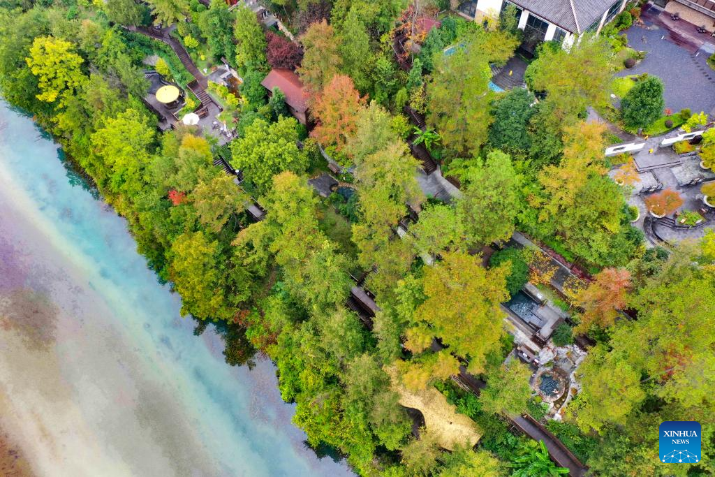 An aerial drone photo taken on Nov. 15, 2023 shows hot springs at a hot spring resort in Shiqian County, southwest China's Guizhou Province. By integrating its rich hot spring resources with tourism, healthcare, and intangible cultural heritage, Shiqian county has boosted local tourism and created employment opportunities, making it an important driving force of rural revitalization. (Xinhua/Liu Xu)