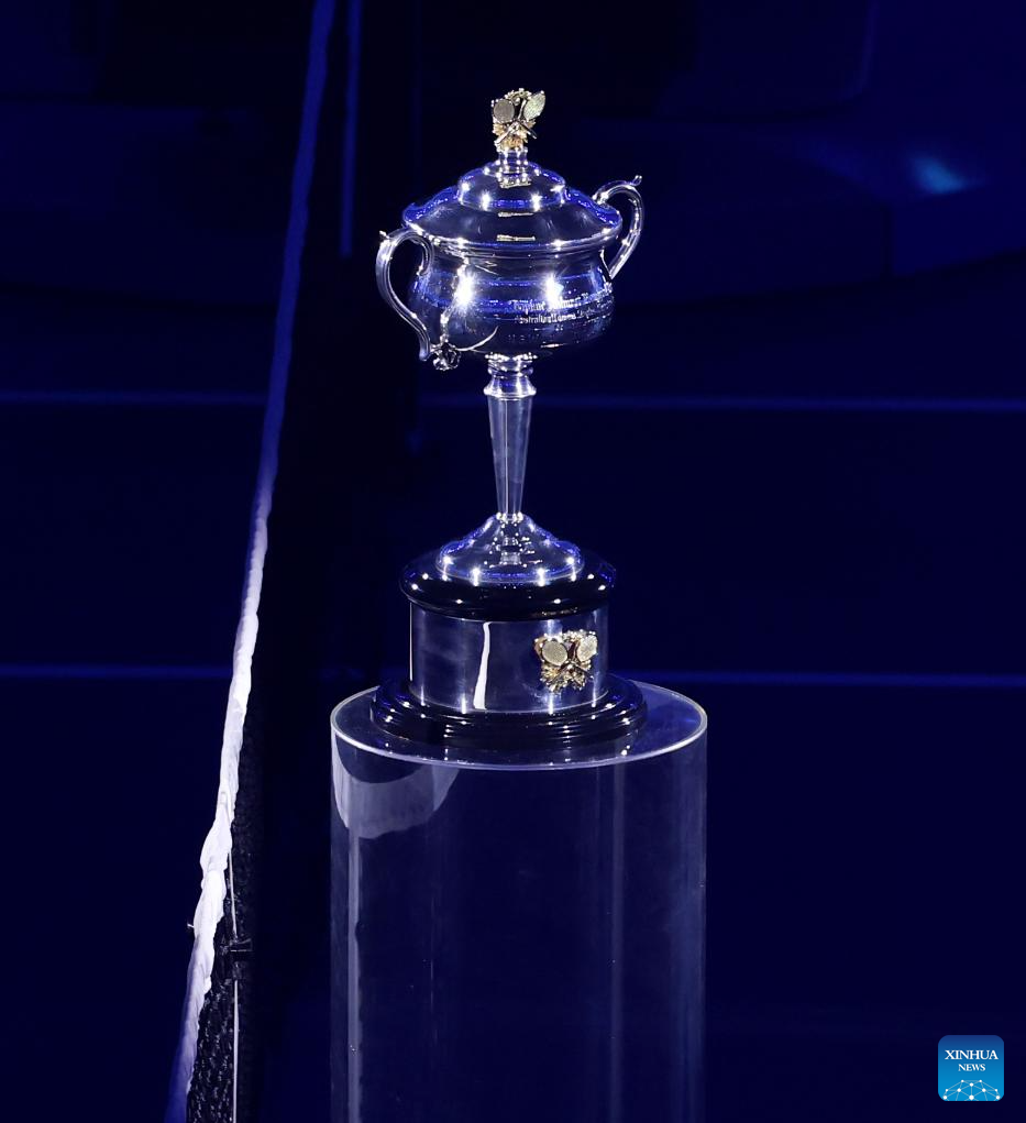The trophy is seen before the women's singles final between Elena Rybakina of Kazakhstan and Aryna Sabalenka of Belarus at the Australian Open tennis tournament in Melbourne, Australia, Jan. 31, 2026. (Xinhua/Ma Ping)