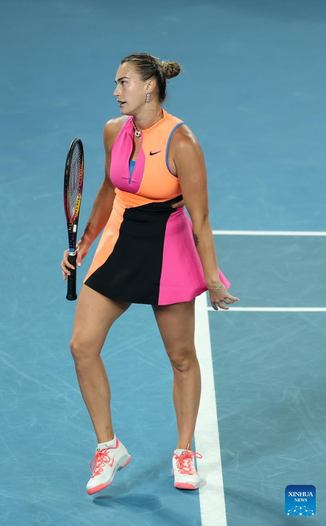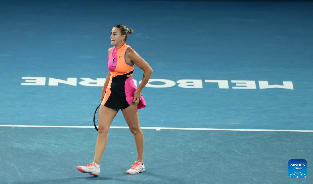 Aryna Sabalenka reacts during the women's singles final between Elena Rybakina of Kazakhstan and Aryna Sabalenka of Belarus at the Australian Open tennis tournament in Melbourne, Australia, Jan. 31, 2026. (Xinhua/Ma Ping)