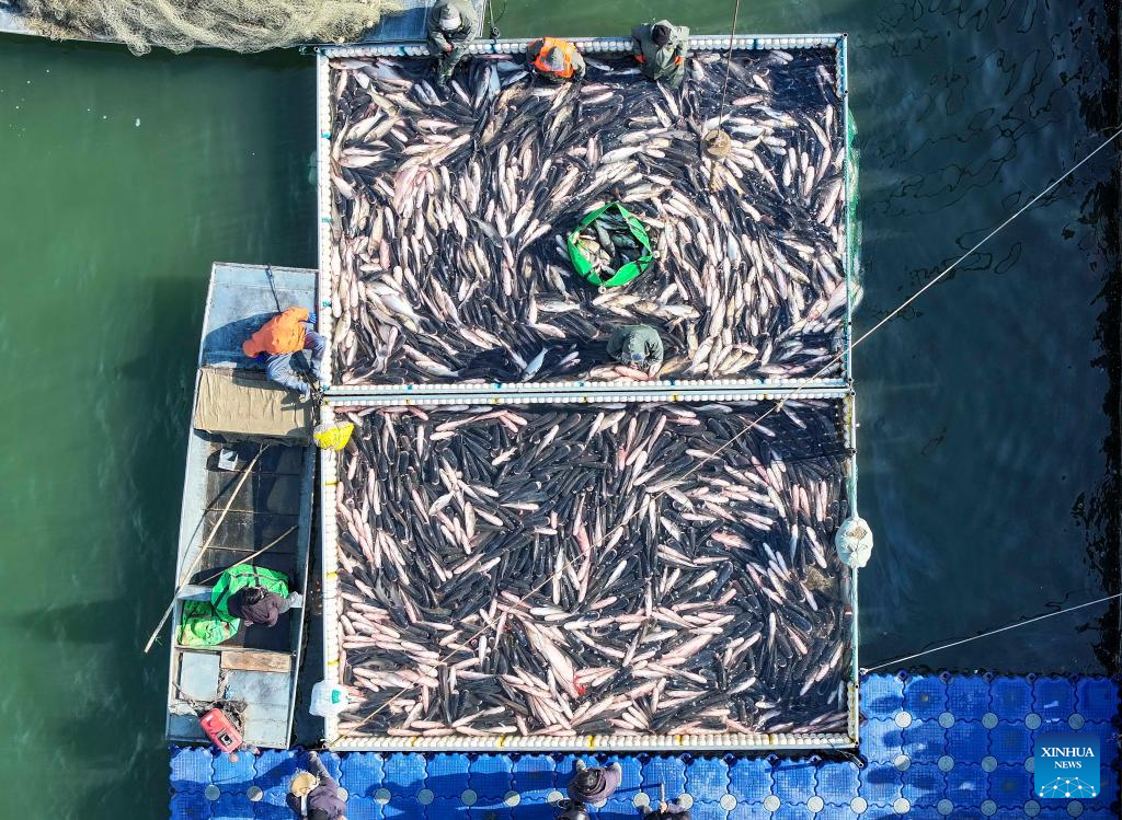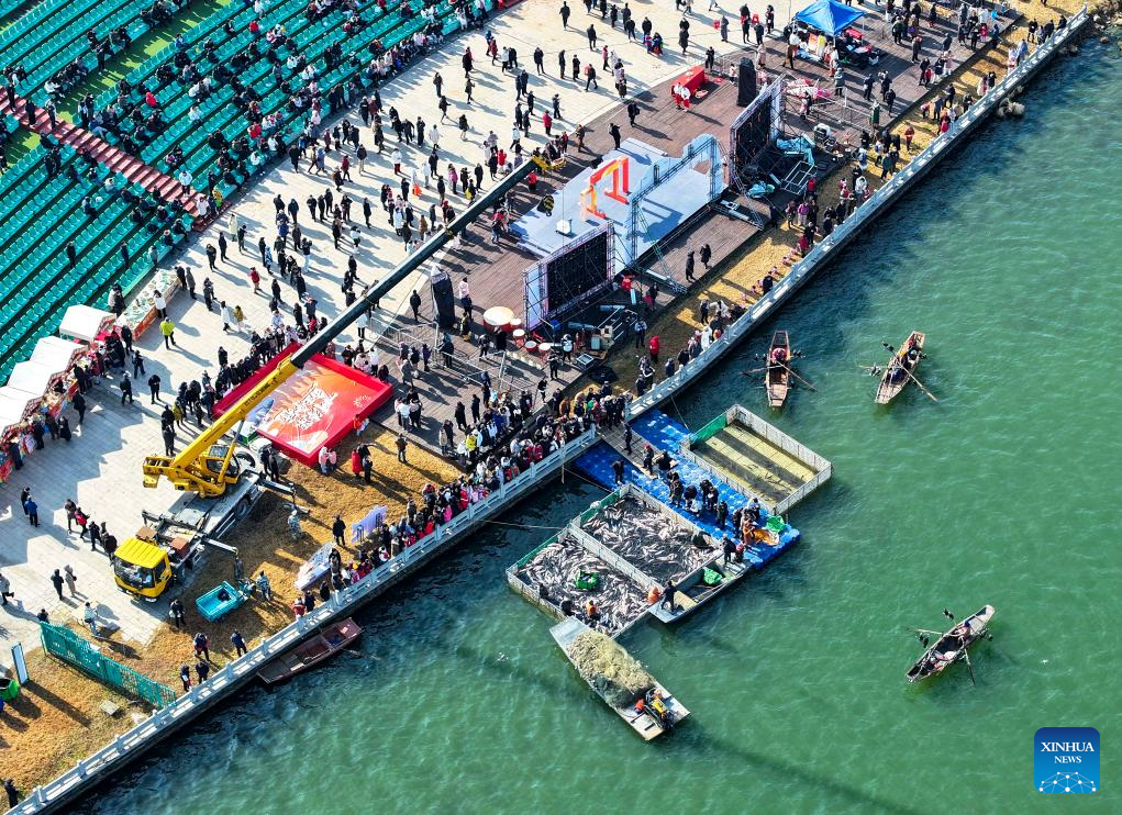 A drone photo shows people visiting a fish market during a winter fishing event in Taizhou, east China's Jiangsu Province, Jan. 31, 2026. (Photo by Tang Dehong/Xinhua)