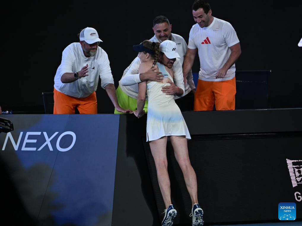 Elena Rybakina (front) hugs her coach after the women's singles final between Elena Rybakina of Kazakhstan and Aryna Sabalenka of Belarus at the Australian Open tennis tournament in Melbourne, Australia, Jan. 31, 2026. (Photo by Wang Shen/Xinhua)