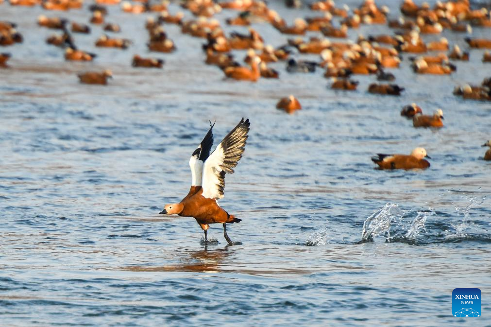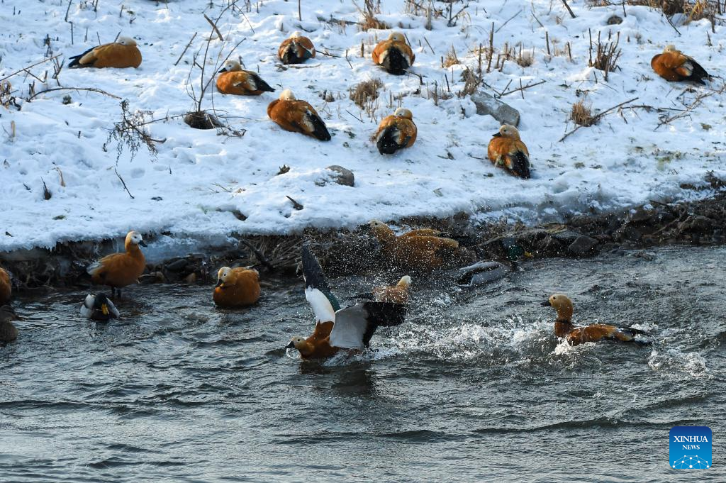 Birds inhabit the waters of Changbai Island in Jilin City, northeast China's Jilin Province, Jan. 28, 2026. Wang Tingting, a post-90s bird protector, stays every day at Changbai Island wetland park, a bird paradise seated by the Songhua River in Jilin City, to care for the birds--providing food and observing their living conditions.