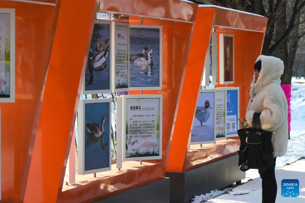A tourist browses the bird posters on Changbai Island in Jilin City, northeast China's Jilin Province, Jan. 28, 2026. Wang Tingting, a post-90s bird protector, stays every day at Changbai Island wetland park, a bird paradise seated by the Songhua River in Jilin City, to care for the birds--providing food and observing their living conditions.