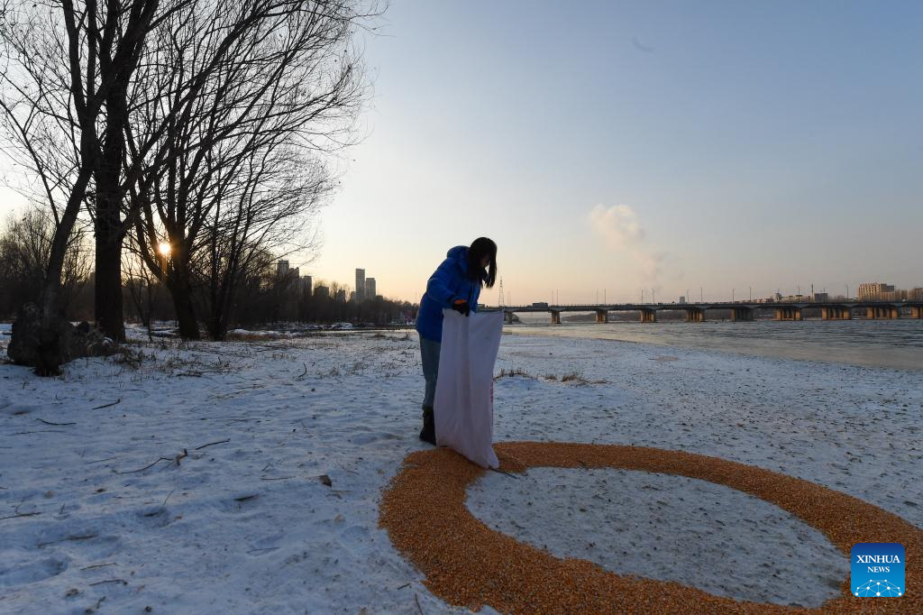 Wang Tingting feeds birds on Changbai Island in Jilin City, northeast China's Jilin Province, Jan. 28, 2026. Wang Tingting, a post-90s bird protector, stays every day at Changbai Island wetland park, a bird paradise seated by the Songhua River in Jilin City, to care for the birds--providing food and observing their living conditions.