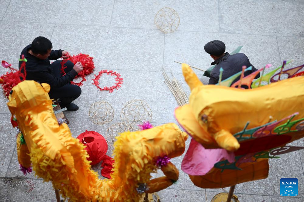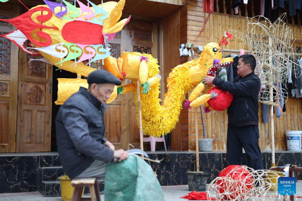 Dai Xin checks a finished Maolong (hairy dragon) latern at his residence in Shiqian County, southwest China's Guizhou Province, Jan. 27, 2026. (Xinhua/Liu Xu)