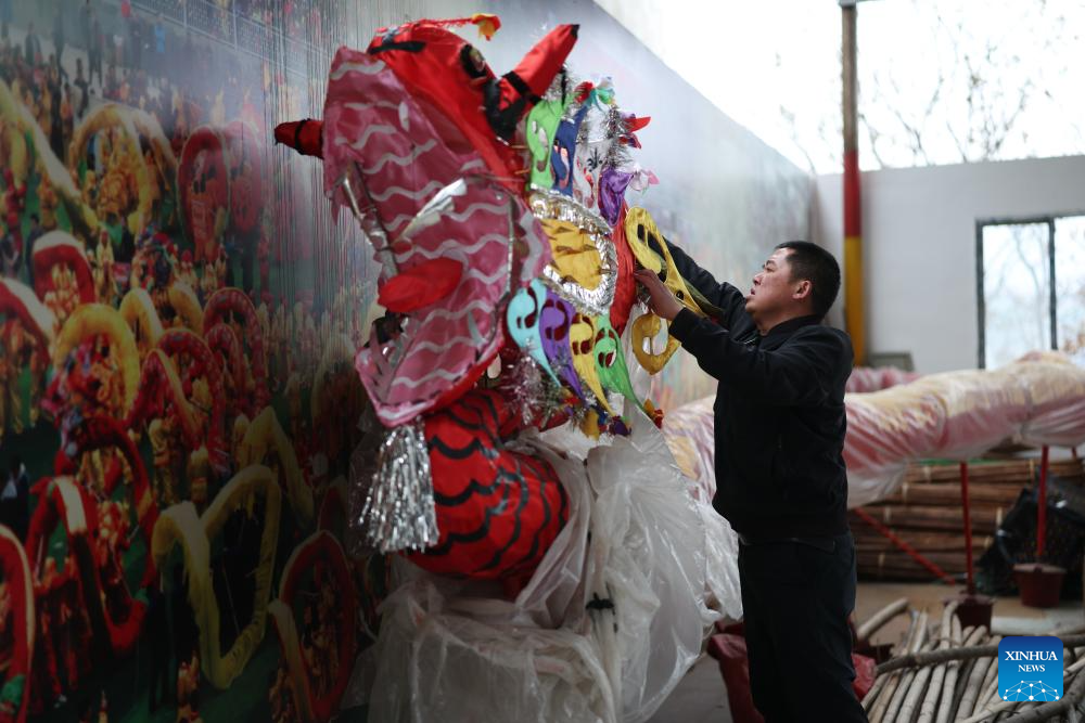 Dai Xin practices dragon dance at his residence in Shiqian County, southwest China's Guizhou Province, Jan. 27, 2026. The "Maolong (hairy dragon) Festival" of Gelao ethnic group is a national-level intangible cultural heritage. Maolong laterns, the theme artifacts of the Maolong Festival, is a school of dragon lanterns unique to Shiqian.