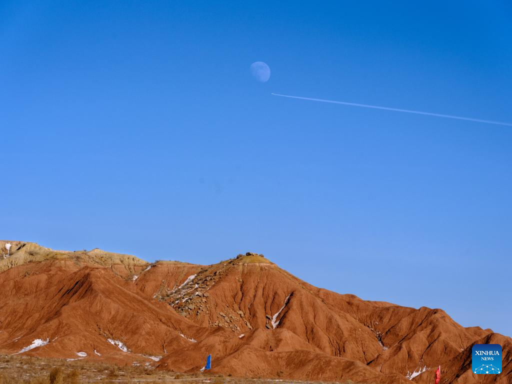 A tourist is seen at the Hongya Tableland in Siziwang Banner, north China's Inner Mongolia Autonomous Region on Jan. 29, 2026 Located in the northern part of Siziwang Banner in Ulanqab, the Hongya Tableland is a key component of the Siziwang National Geopark in north China's Inner Mongolia Autonomous Region. Featuring towering red hills and deep gullies, the landscape forms a majestic painting with lingering snow. (Xinhua/Bei He)