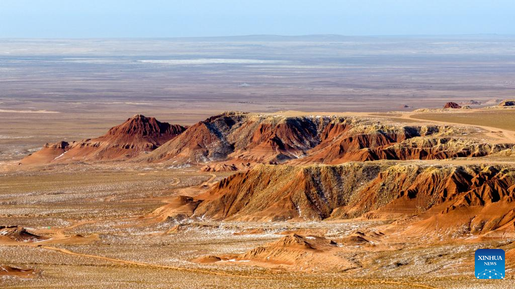 An aerial drone photo taken on Jan. 29, 2026 shows a scene of the Hongya Tableland in Siziwang Banner, north China's Inner Mongolia Autonomous Region. Located in the northern part of Siziwang Banner in Ulanqab, the Hongya Tableland is a key component of the Siziwang National Geopark in north China's Inner Mongolia Autonomous Region. Featuring towering red hills and deep gullies, the landscape forms a majestic painting with lingering snow. (Xinhua/Bei He)