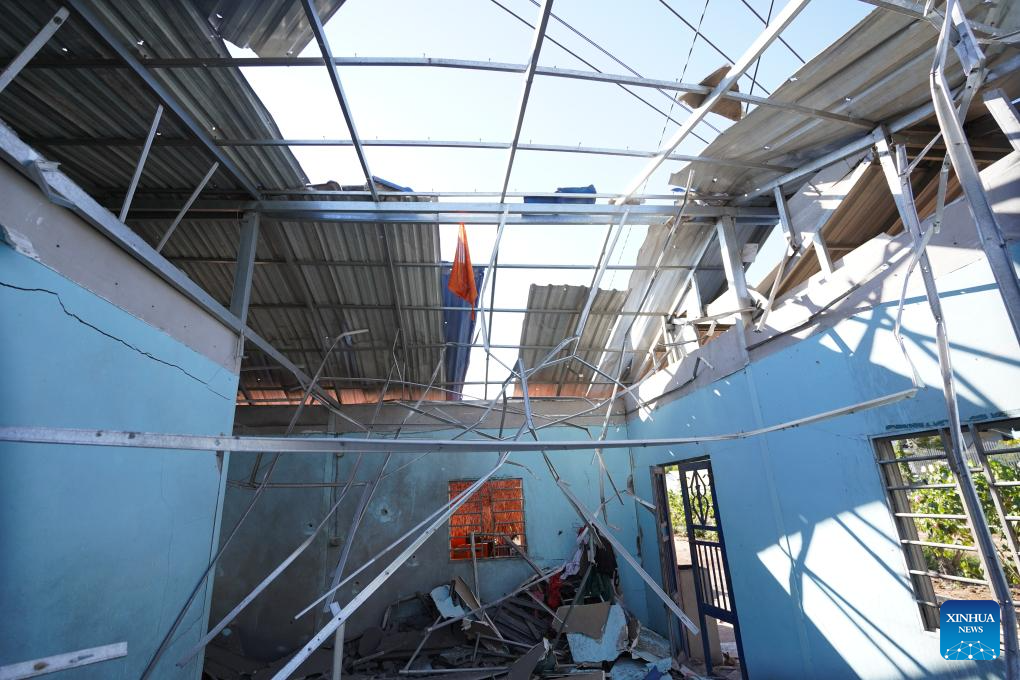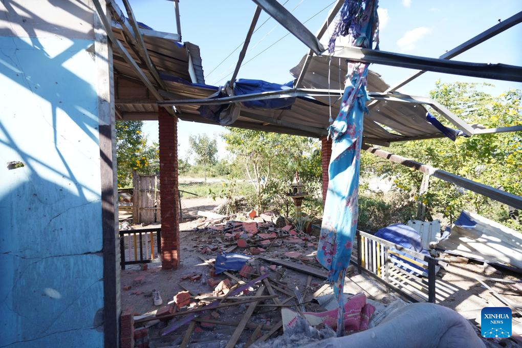 A civilian house damaged by shrapnel of artillery shells fired by Thai military forces is seen in Banteay Meanchey province, Cambodia, Dec. 16, 2025. The Thai military forces have continued to fire artillery shells at many locations in Cambodian territory from Monday midnight until Tuesday morning, said a Cambodian defense spokesperson on Tuesday. Cambodian Defense Ministry's Undersecretary of State and Spokesperson Lt. Gen. Maly Socheata made the remarks in a press briefing. On the same day, Cambodia's Interior Ministry said in a press release that the civilian death toll in Cambodia has increased to 15. (Agence Kampuchea Presse/Handout via Xinhua)