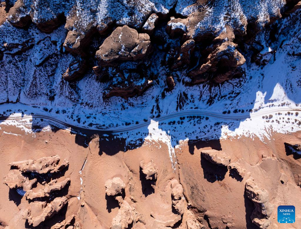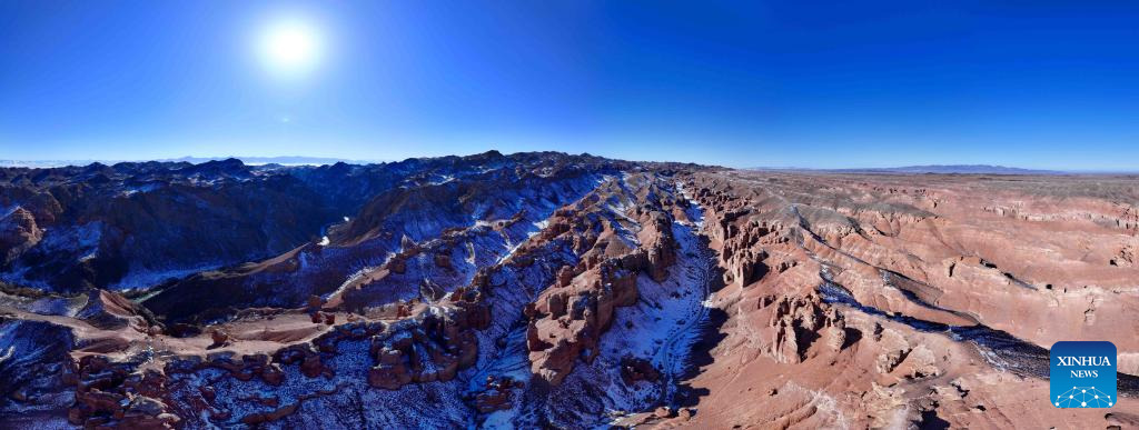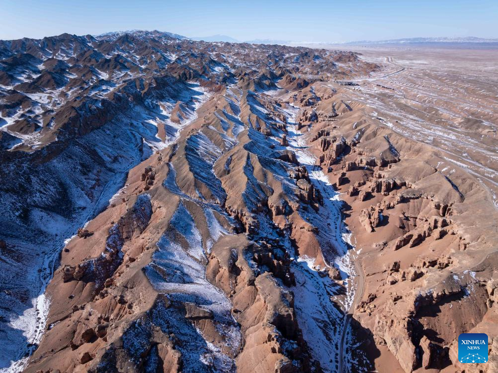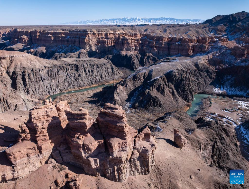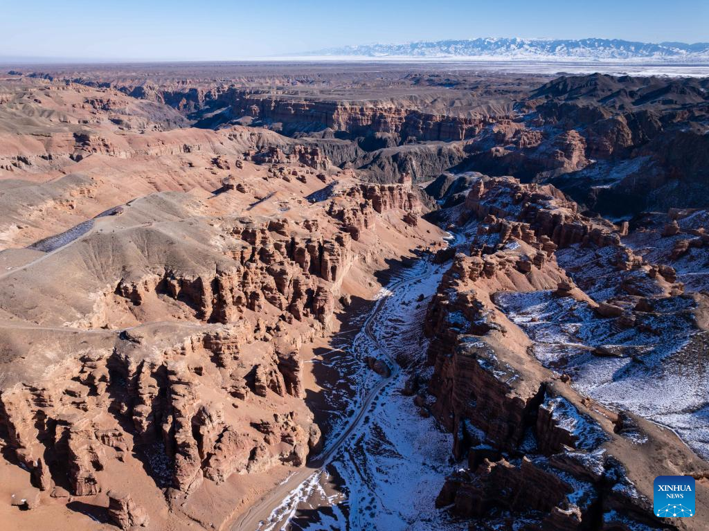An aerial drone photo taken on Jan. 30, 2026 shows the scenery of the Charyn Canyon in Almaty Region, Kazakhstan. (Xinhua/Li Renzi)