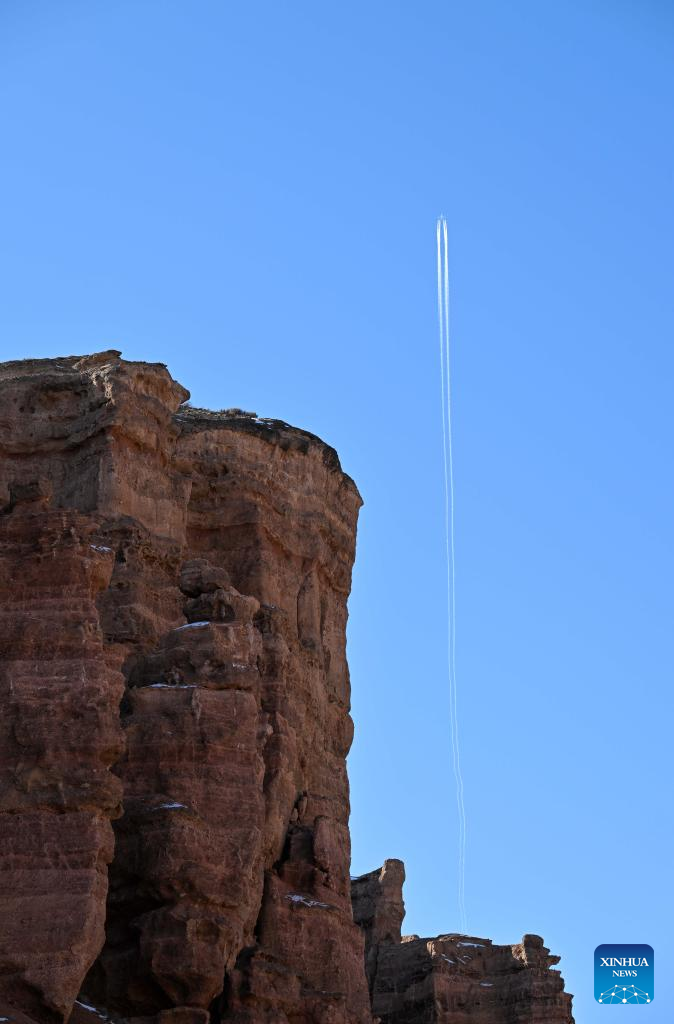 An airplane flies over the Charyn Canyon in Almaty Region, Kazakhstan, Jan. 30, 2026. (Xinhua/Li Renzi)