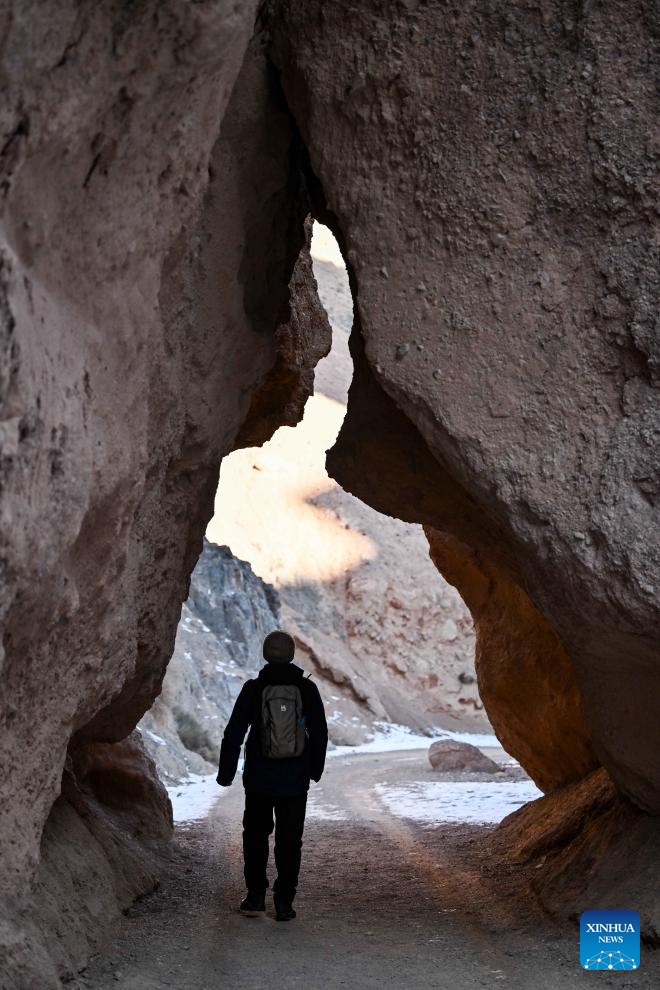 A man visits the Charyn Canyon in Almaty Region, Kazakhstan, Jan. 30, 2026. (Xinhua/Li Renzi)