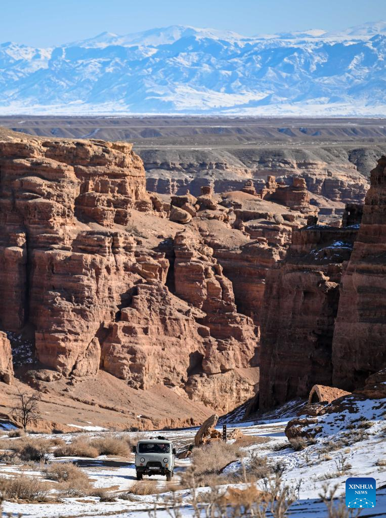 A sightseeing vehicle travels at the Charyn Canyon in Almaty Region, Kazakhstan, Jan. 30, 2026. (Xinhua/Li Renzi)