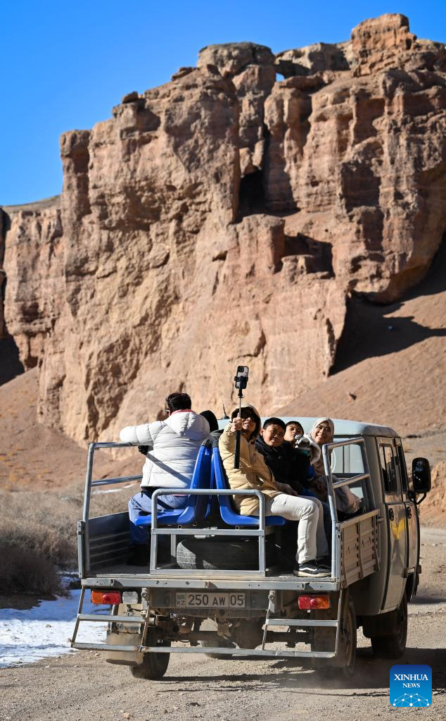 Visitors take a sightseeing bus tour at the Charyn Canyon in Almaty Region, Kazakhstan, Jan. 30, 2026. (Xinhua/Li Renzi)