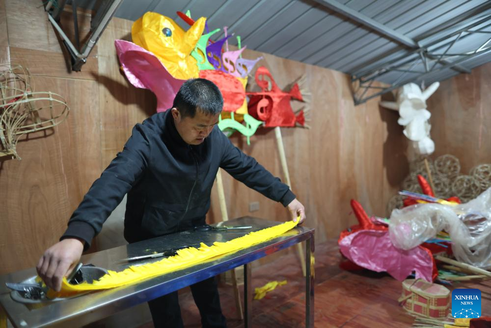 Dai Xin checks a finished Maolong (hairy dragon) latern at his residence in Shiqian County, southwest China's Guizhou Province, Jan. 27, 2026. (Xinhua/Liu Xu)